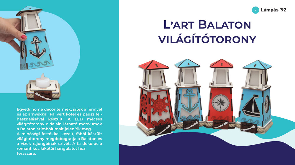 Szervezetünk műhelyeiben dolgozó értelmi fogyatékossággal élő kézművesek – designerek közreműködésével – megalkották azt a különleges termékcsaládot, mely a L’Art BalatON nevet kapta. A tervezésben az Alapítvány Kárpát-medencei képzőművészeti programjának tehetséges alkotói is részt vettek.