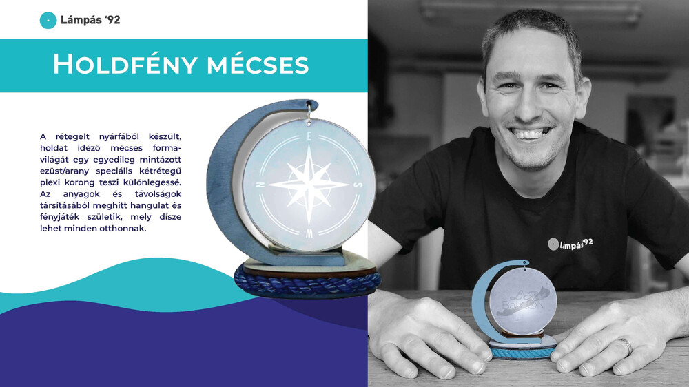 A rétegelt nyárfából készült, holdat idéző mécses formavilágát egyedileg mintázott ezüst/arany speciális kétrétegű plexi korong teszi különlegessé.